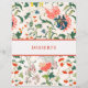 Custom double sided recipe chapter divider page for an elegant blooming floral recipe cookbook binder; one design of a matching set. Features an elegant blooming floral pattern in vintage style with customisable text presented on a coordinating neutral banner.
