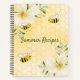 Yellow, white background with a honeycomb pattern. Decorated with light yellow, cream coloured tropical florals flowers, hibiscus and happy bumble bees. The text: Summer recipes in green hand lettered style script. Perfect as a notebook for your summer recipes.