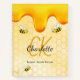 Yellow, white background with a bee honeycomb pattern and happy smiling bumble bees. Decorated with sweet, golden honey dripping. Personalise and add your name, monogram initials, and a title golden and black letters.  The name is written with a hand lettered style script. For your desserts, sweets, bakery recipes.