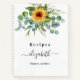 A white background. Decorated with sunflowers, eucalyptus greenery. Add a name, text. The name is written with a modern hand lettered style script with swashes.
