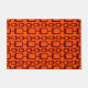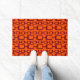 This doormat has a mid-century modern design of maroon rounded rectangles connected together on a field of orange.