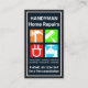 Near the centre of the card are four creative icon logos that can represent some of the work you might offer e.g. the brown hammer can be for carpentry and renovation works, the roller brush is for home painting, the power plug is for electrical works and lastly the blue faucet for plumbing. To reflect this, below this design is a list of services that you can change to suit your own needs. Towards the top lies the business name with the contact details near the base of the card.