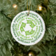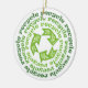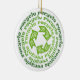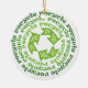 Recycle sign custom ornament featuring a circle made of the word recycle in gradient shades of green and the recycling sign in the centre.