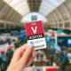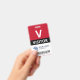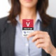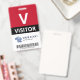 Vertical visitor badge with a large V against a white background. Visitor beneath in clean letters. Add your logo and bar code. Visitor badge personalised with logo and barcode in a minimalist design in red, white, and black.
