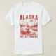This white t-shirt features a monochromatic red sketch-style illustration of a mother grizzly bear and her cub sitting by a river in an Alaskan wilderness scene. Mountains, trees, and a setting or rising sun are depicted in the background. The word "ALASKA" is printed in bold red at the top, and "THE LAST FRONTIER" is in smaller red letters at the bottom.