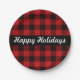 Red and Black buffalo plaid, happy holidays Paper Plate