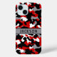 Customize this red, black, gray and white camouflage iPhone 15 case with your name in a trendy modern CAP font in black on gray. It's masculine and perfect for your favorite military, hunting, country or outdoorsman!