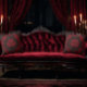 This Gothic or Dark Academia throw pillow has a red and black design with a Damask motif.