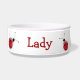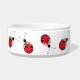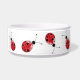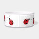 Pretty dog food dish done with cute graphics of red and black ladybugs all around the white ceramic dish. Customise the red text for a personalised bowl your dog can be proud of. Makes a great gift idea.