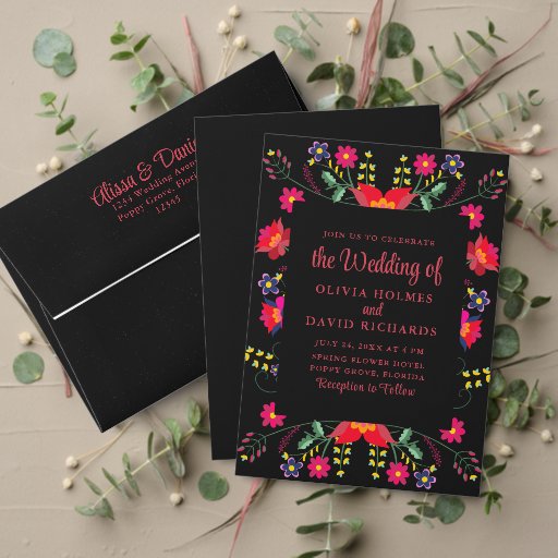 Celebrate your special day with our vibrant Red and Black Mexican Floral Fiesta Wedding Invite! This stunning invitation features a striking black background adorned with colourful Mexican flowers, predominantly shades of red complemented by accents of purple, pink, and yellow blooms.