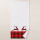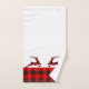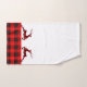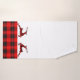 A red and black plaid border with Christmas deer in the same plaid over white background.