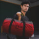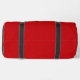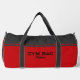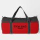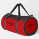 Sleek and modern gym duffel bag design with customizable sports typography in bold black against a vibrant red background. Accented with dark gray and red stripes for a stylish touch.