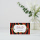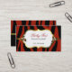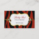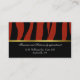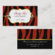 Elegant animal print business card, with a red and black coloured zebra print as a background, on both the front and back of the card. A decorative gold tone stripe runs across the middle, on the front and backside. A gold looking framed text area has pretty graphics of gold leaves, on either side, and black customisable text ready to personalise for your business.