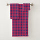 Red and blue plaid towel set on a silver rod above, with a folded washcloth displaying the same pattern below, revealing a white underside.