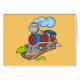 A red and blue train design on train T-shirts, mugs, buttons, tote bags, and other train items sure to please kids of every age who love trains!