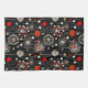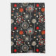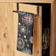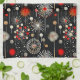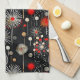 Red and cream modern abstract stars burst all over the dark background of this festive kitchen towel