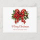 Christmas holiday postcard with a festive Christmas bow in red and gold. Surrounded by poinsettia flowers, pine and Christmas decorations.