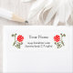 A custom return address label with outlined and standard letters centred between vintage art of daisies and curling decoration in red and golds, restored from an antique manuscript.