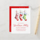 This design features a Christmas party invitation postcard, with a festive watercolor design, an elegant traditional design, with modern minimalist style, simple calligraphy script typography, a traditional holiday party invitations, with red and green whimsical cute stockings