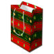 Present your gifts in style! Perfect for festive presents, this Medium Gift Bag, featuring red and green large horizontal stripes, embellished with green Christmas trees, red flowers with green leaves and cute golden stars, will add a burst of colour to your gift giving. This is a great way to present any special surprise this Christmas!