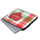 A laptop sleeve built with Christmas colours, a red and green plaid pattern and a heart tag. Customise the laptop sleeve with your name or your own text among other options.