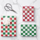 A set of bright red and green check pattern retro Christmas wrapping sheets, with one red, one green, and one red and green sheet.