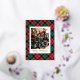 Festive winter plaid photo card features a favorite vertical photo framed by a border and accents of real gold foil and a classic yet modern red, green and black Scottish tartan plaid patterned background. Personalize the custom "Merry Christmas" text with your preferred wording, family name, and the year. The back of the card includes an additional horizontal photo with custom holiday message wording.