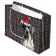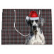 This festive Christmas gift bag features a charming Great Dane dog dressed for the holidays. The dog is sporting a red Santa hat. The background is a cheerful red and grey plaid pattern, adding to the holiday spirit. The bag has white handles, making it easy to carry and perfect for gifting. This unique and adorable design is sure to bring smiles to everyone who sees it.