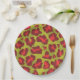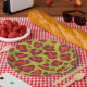 Red and olive green leopard print paper plate that displays an animal print pattern.