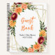 This beautiful and elegant baby shower guest book features watercolor burgundy red and orange flowers with foliage on a gold geometric frame. The text combines handwritten script and serif fonts for a stylish and modern look. This is perfect for an autumn fall rustic baby shower.