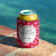 Celebrate the bride to be and her final days of unmarried freedom with fun and flirty custom can coolers that feature a pattern of leopard print spots in girly red and pink and personalised name and title text on the other side. Chic typography is easy to customise with your event details and personalise for each guest as a welcome gift or party favour.