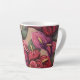 A latte mug printed with a hand-drawn red and pink anthurium design.