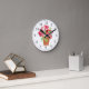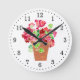 A clay pot blooming with colourful red and pink geraniums decorates this artistic floral themed clock with hour numbers and minute indicators.