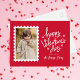 Cute Valentine's Day photo postcard featuring your vertical photo inside of a white postage stamp frame. The phrase "Happy Valentine's Day" is displayed in whimsical, white hand-lettering surrounded by light pink hearts. Personalise the front of the photo Valentine's Day postcard with your family name in white lettering on a red background. The postcard reverses to display your return address and personal message in red lettering.