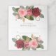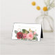 Here's a pretty folded wedding place card that features a stunning bouquet of red and pink roses nestled among green leaves and gold swirls. The image is printed on both front and back of the card, with several custom text fields in gold. The back of the card is solid black. This card matches the Sparkle Stripe Rose Wedding Invitations and other wedding products in our store.
