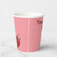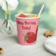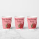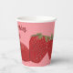 Add a sweet touch to any party with personalised paper cups. These cups feature illustrations of ripe red strawberries set against a pink background. Your custom text appears in bold, dark red lettering.