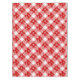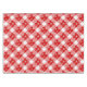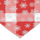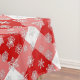 Tablecloth in a large, deep red and white buffalo plaid pattern, with a flurry white snowflakes