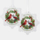 Red and white cardinal in a sweet Christmas wreath made of holly berries and pine branches.