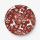 Red and white Christmas pattern with reindeer, snowflakes, spruce branches.