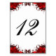 © Sunny Mars Designs- Floral Hibiscus: Red on White Vertical Wedding Table Number Cards - Customisable elegant, stylish, beautiful, modern, chic trendy custom printed wedding reception table number card with gorgeous, classy dark red, ruby, crimson, maroon or burgundy swirly tropical hibiscus floral design against a customisable white background.