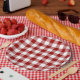 Dark red, white, and light red squares form a bold, buffalo plaid. The red and white gingham pattern makes me think of Christmas and fun summer picnics.