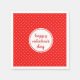 A deep, red background with tiny micro hearts sets the stage for this Valentine party napkin.Happy Valentine's Day is written in a hip casual font in the centre of a white circle that is edged in red.