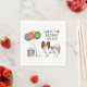 Destei's original cartoon illustration of a red and white coat colour Papillon breed dog. Next to the dog there are colourful birthday balloons tied on a dog bone and a purple and yellow colour present box. The background has a playful pattern of colourful pastel confetti on a white background. There is also a personalizable text area.