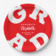 GRAD in bold white lettering curves around the edges of these red graduation party paper plates - available in 2 sizes. Congratulations above the name of your graduate and the Class of below. The perfect addition to your table decor for upcoming grad parties. **TIP: Click on CUSTOMIZE button; click on COLOR box on top right; enter your colour hex code in the #xxxxxx box to match your school colours. SEE ENTIRE COLLECTION of pre-done colour combinations and more in our store.