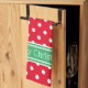 This cute kitchen towel features crisp white polka dots on a background of bright red. Personalise the holiday green and white stripe with your choice of special text. Makes a great housewarming gift at Christmas!