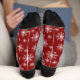 A Unisex Pair Of Red Crew Socks Patterned In White Snowflakes For Winter