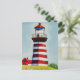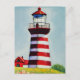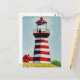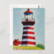 Just a postcard to keep in touch with someone. An illustration of a red and white striped lighthouse on the ocean.