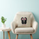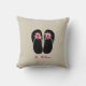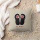 A pillow for teachers featuring an illustration of a pair of black flip flops decorated with red apples. Personalise with your name in red. Opposite side is red.