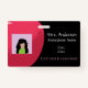 A modern horizontal black badge for any school staff member featuring part of a red apple . Personalise it with the employee's photo , name , job title , school name and the establishment's address . A small white rectangle is provided on the back for the teacher's signature or a bar code . Check our collection to see additional colours and badge orientations .