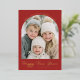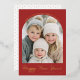 A warm and cheerful New Year photo card featuring a bold red background and a soft arched frame that beautifully highlights your favorite winter portrait. The curved upper greeting adds an uplifting, celebratory touch, while the elegant script “Happy New Year” creates a bright and joyful finish. Personalized family text completes the look with warmth and polish. A charming and modern way to welcome the year ahead and share heartfelt wishes with loved ones.